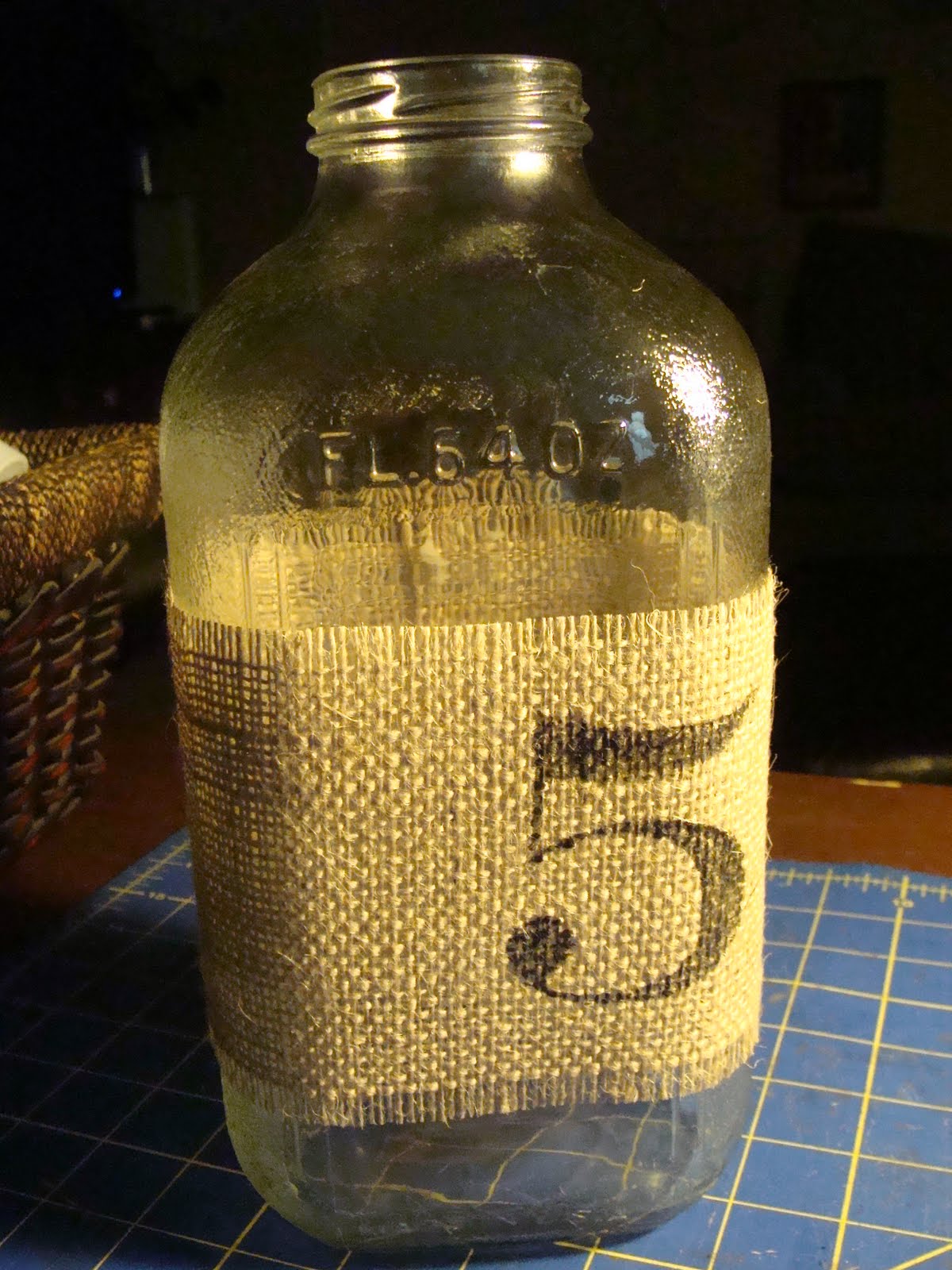 I'd found 3 of these big glass juice bottles at a thrift store earlier in the week. They're cute as is, but I thought I'd try dressing them up a little. (Sorry for the badly lit night-time photos, by the way.)